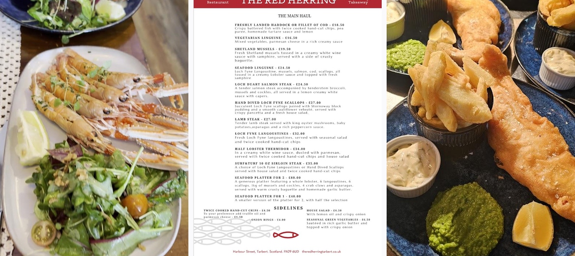 Discover The Red Herring Seafood Restaurant in Tarbert, where our renowned chef serves up delectable fish and chips, seafood linguine, and rich Cullen skink. Enjoy a cozy evening with a vast selection of wines and fresh mussels. Book your table today for an unforgettable dining experience!